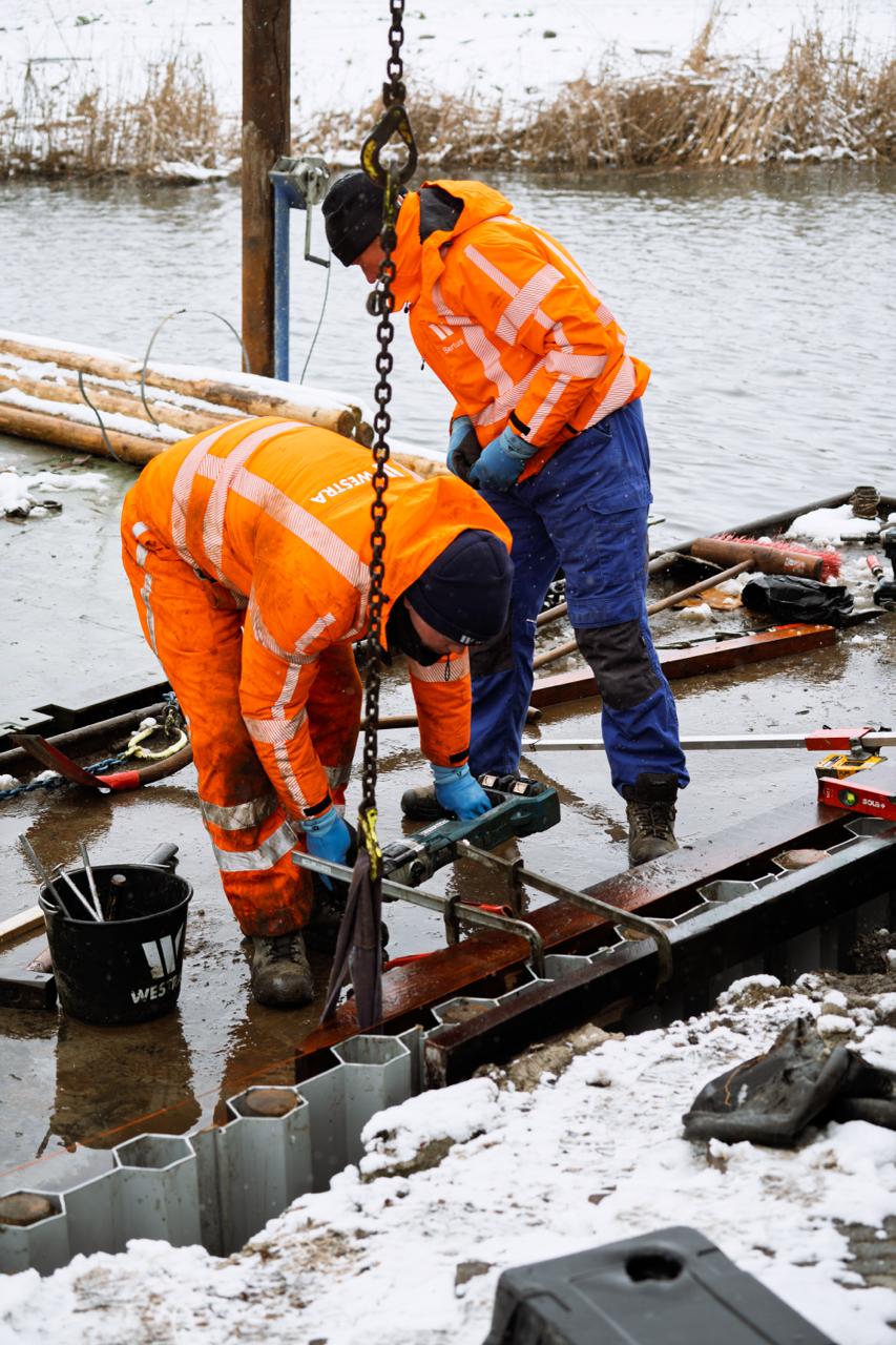De grootste uitdaging was de bereikbaarheid; de tuinen waren te kwetsbaar voor zware kranen. Daarom hebben we alles vanaf het water opgelost. Met onze midikraan op een stabiel ponton konden we de palen en schotten trillingsarm de grond in trillen. We hebben de bestaande ankers waar mogelijk hergebruikt en nieuwe ankers bijgeplaatst voor extra stevigheid. Het is een nette, onderhoudsvrije oplossing geworden waar de bewoners geen omkijken meer naar hebben.
